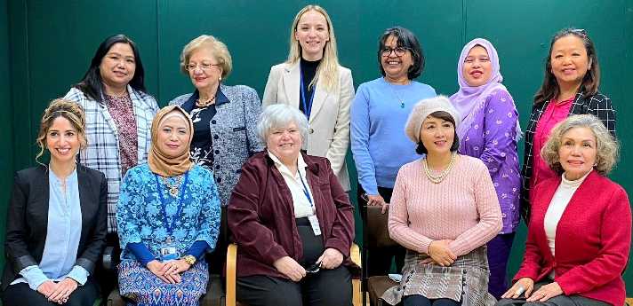 The elected Board for 2022: top row: Barbara Bao (Philippines) 1st VP; Tamara Babayan-Bohdjalian (Iran-Austria) 2nd VP; Yuliya Tulubtsova (Belarus) Publicity Chairwoman; Kalpana Scholtes Dash (India-Belgium) Bazaar Chairwoman; Maya Widyasari Subki (Indonesia) Membership Chairwoman; Marizel Rojas (Philippines) Newsletter Editor; bottom row: Azin Forooghi (Canada) Secretary; Peggy Nagashima (Indonesia) Activities Chairwoman; Cathy Kieffer (Canada) President; Rui Qing Zhou (China) Treasurer; Dalila Leon-Kostal (Mexico) Welcoming Chairwoman